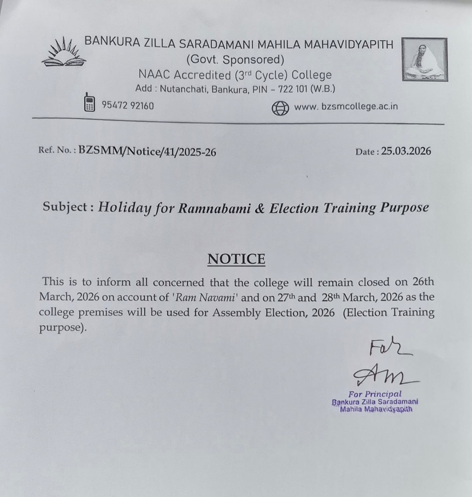 read more...It is my proud privilege to welcome you to the official website of Bankura Zilla Saradamani Mahila Mahavidyapith, a premier institution named in reverence to Maa Sarada Devi, whose life epitomised wisdom, compassion and empowerment through education. Inspired by her ideals, our college remains committed to nurturing young minds with values, knowledge and skills that are essential for leadership in today’s global society. In today’s competitive global environment, society expects graduates to possess not only subject knowledge but also strong communication skills, teamwork, time management, critical thinking, and problem-solving abilities.