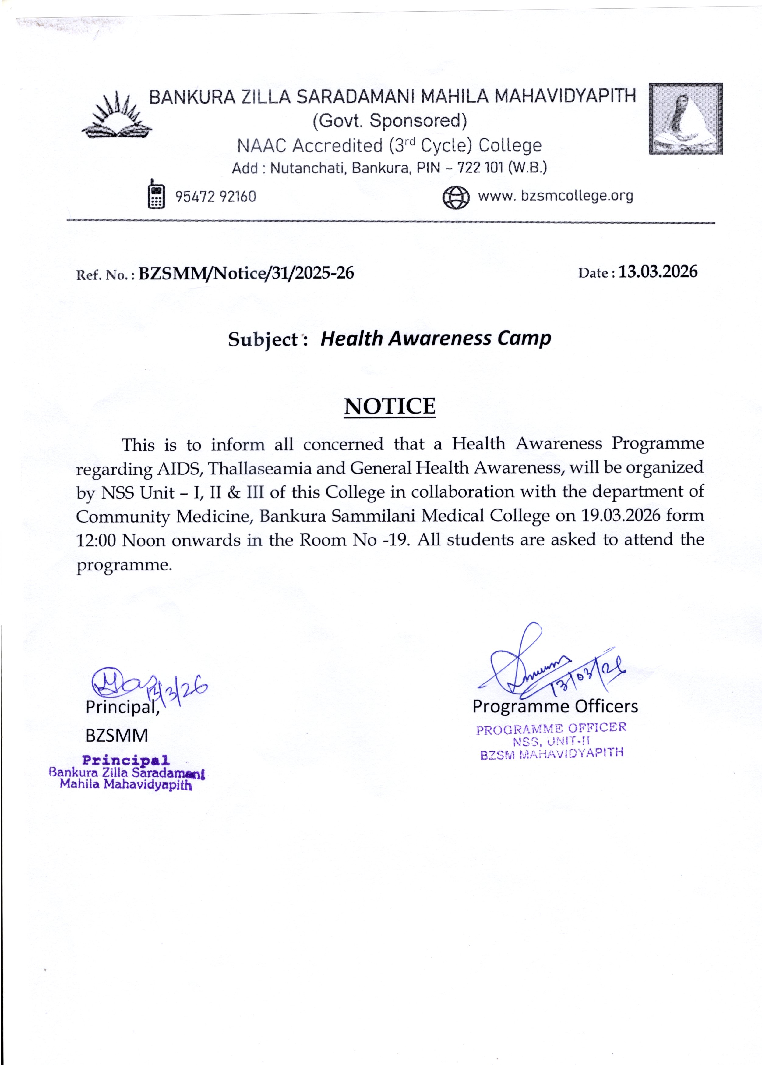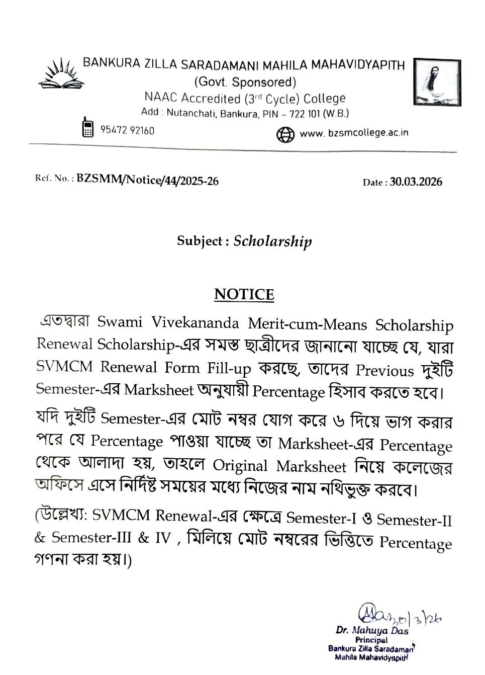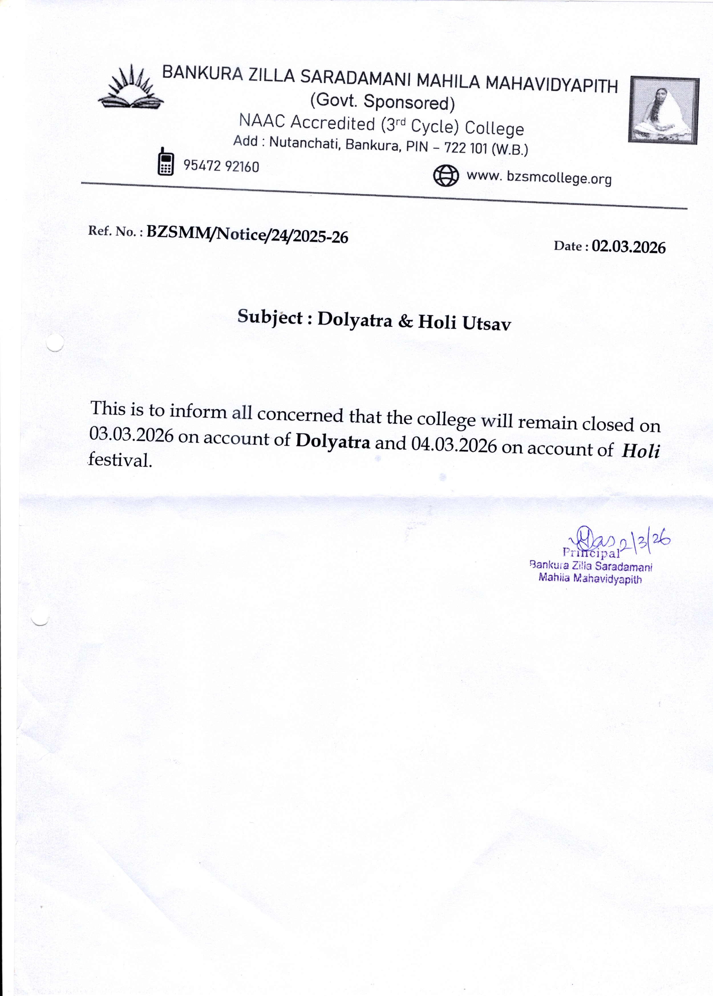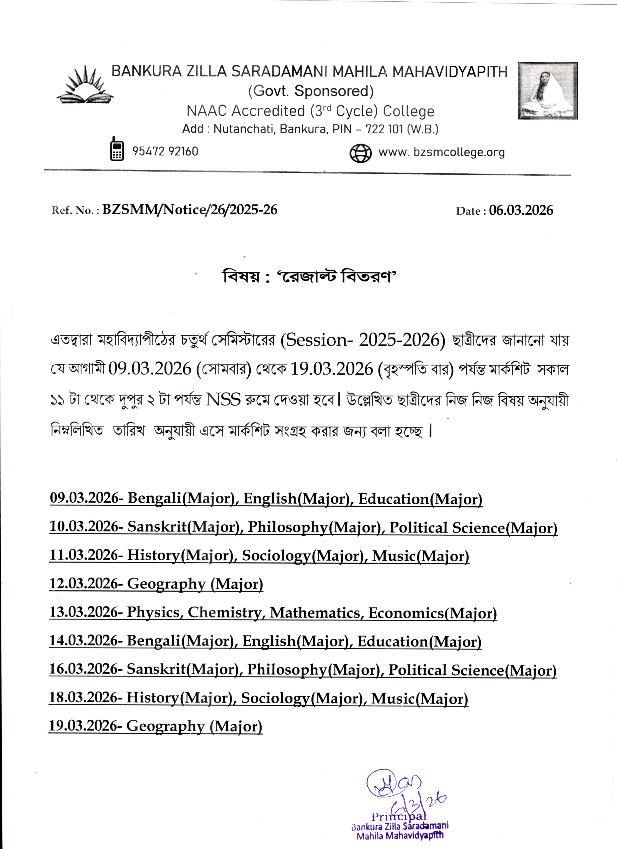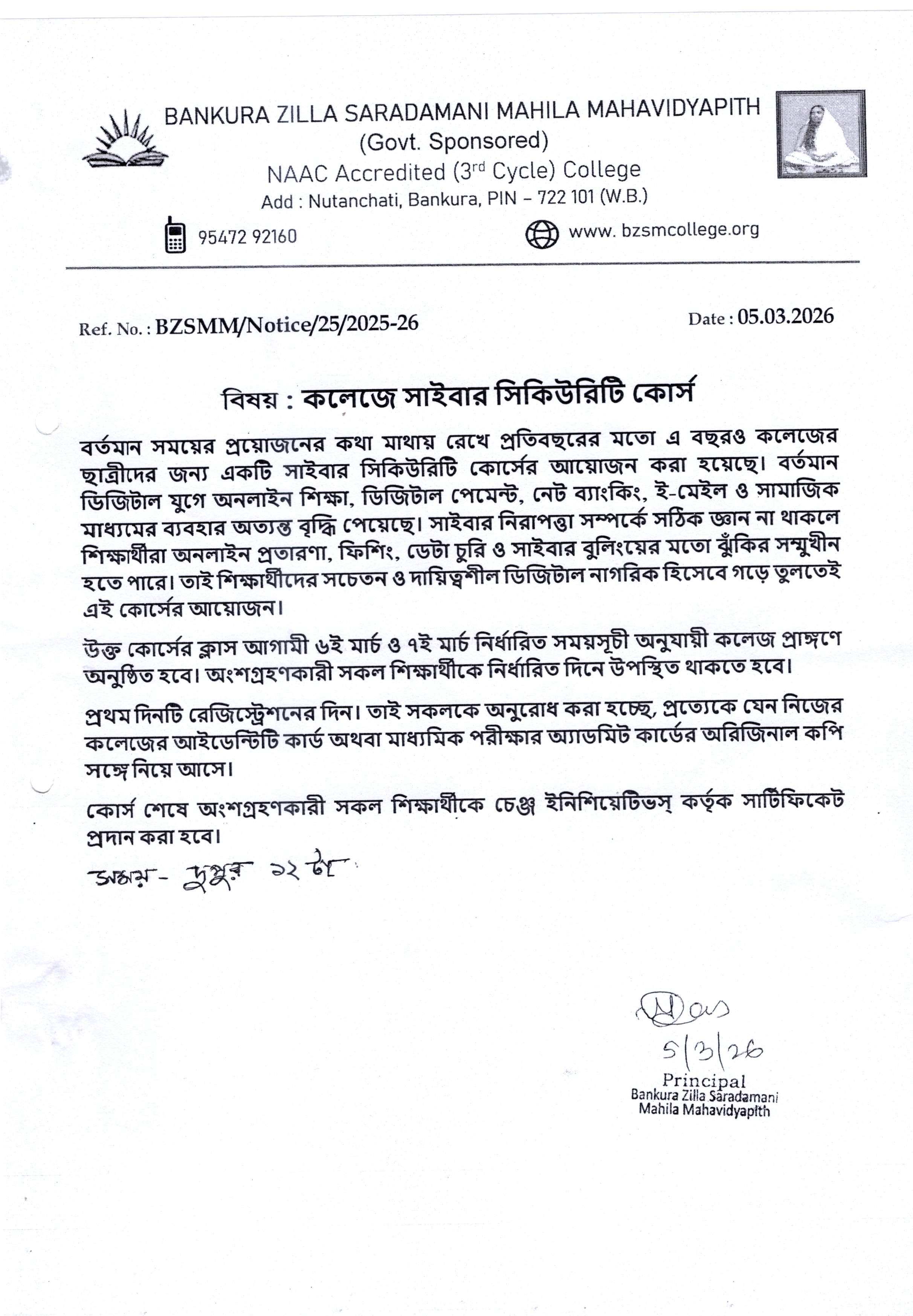 read more...It is my proud privilege to welcome you to the official website of Bankura Zilla Saradamani Mahila Mahavidyapith, a premier institution named in reverence to Maa Sarada Devi, whose life epitomised wisdom, compassion and empowerment through education. Inspired by her ideals, our college remains committed to nurturing young minds with values, knowledge and skills that are essential for leadership in today’s global society. In today’s competitive global environment, society expects graduates to possess not only subject knowledge but also strong communication skills, teamwork, time management, critical thinking, and problem-solving abilities.